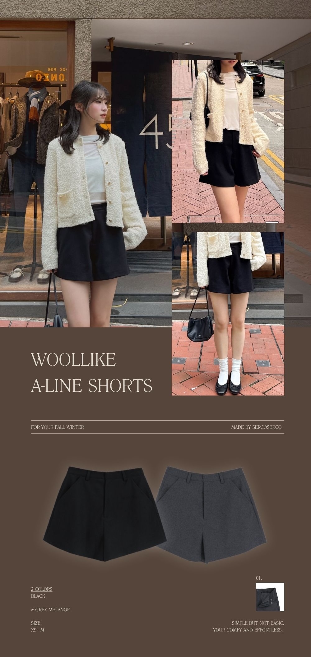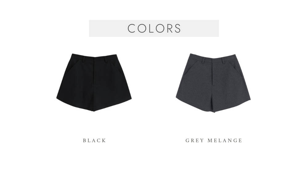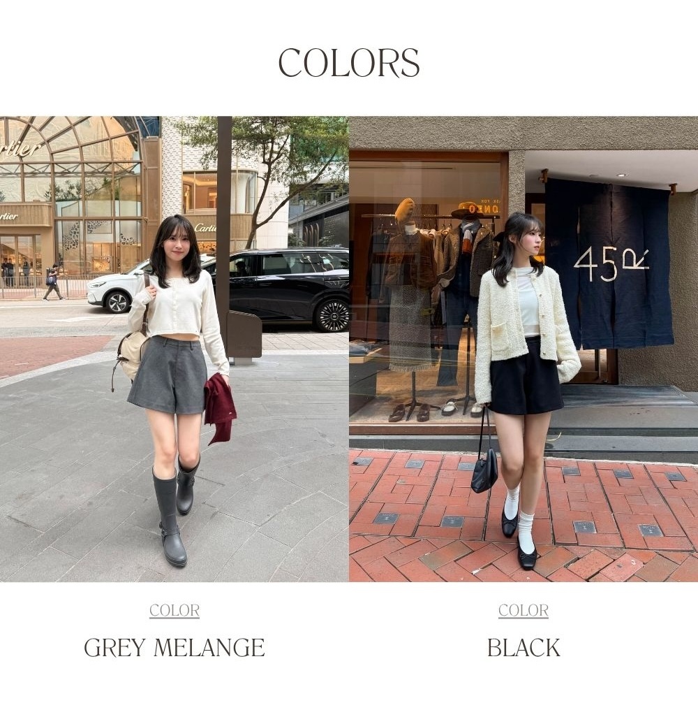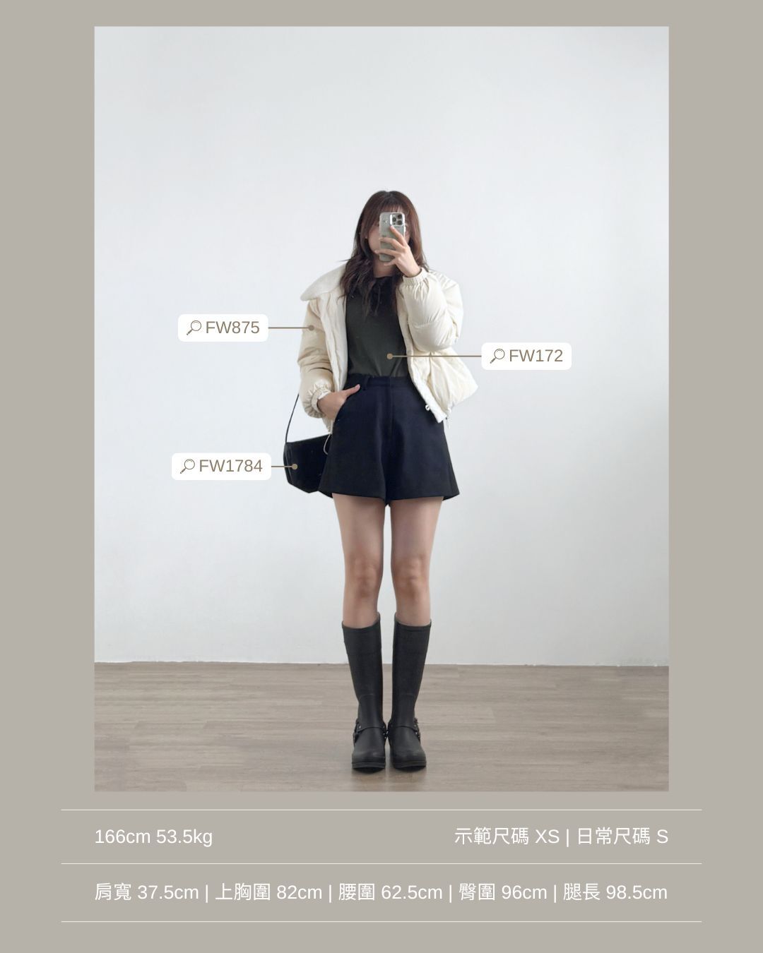 中等厚度 / 仿毛呢質感布料 / 前方兩插袋 / 後半橡筋腰褲頭 / 裝飾性一字袋 / 扣環+隱形鈕釦開合